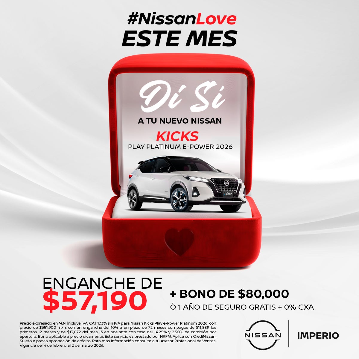 Precio expresado en M.N. Incluye IVA. CAT 17.3% sin IVA para Nissan Kicks Play e-Power Platinum 2026 con precio de $651,900 mxn, con un enganche del 10% a un plazo de 72 meses con pagos de $11,889 los primeros 12 meses y de $13,072 del mes 13 en adelante con tasa del 14.25% y 2.50% de comisión por apertura. Bono aplicable a precio úicamente. Este servicio es prestado por NRFM. Aplica con CrediNissan. Sujeto a previa aprobación de crédito. Para más información consulta a tu Asesor Profesional de Ventas. Vigencia del 4 de febrero al 2 de marzo 2026.