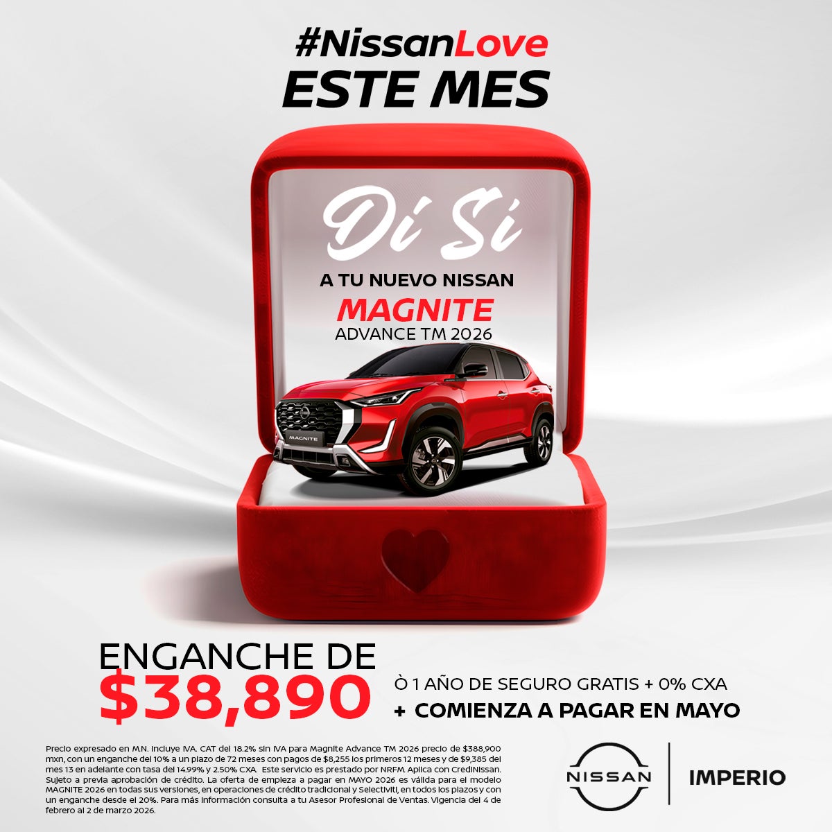 Precio expresado en M.N. Incluye IVA. CAT del 18.2% sin IVA para Magnite Advance TM 2026 precio de $388,900 mxn, con un enganche del 10% a un plazo de 72 meses con pagos de $8,255 los primeros 12 meses y de $9,385 del mes 13 en adelante con tasa del 14.99% y 2.50% CXA. Este servicio es prestado por NRFM. Aplica con CrediNissan. Sujeto a previa aprobación de crédito. La oferta de empieza a pagar en MAYO 2026 es válida para el modelo MAGNITE 2026 en todas sus versiones, en operaciones de crédito tradicional y Selectiviti, en todos los plazos y con un enganche desde el 20%. Para más información consulta a tu Asesor Profesional de Ventas. Vigencia del 4 de febrero al 2 de marzo 2026.