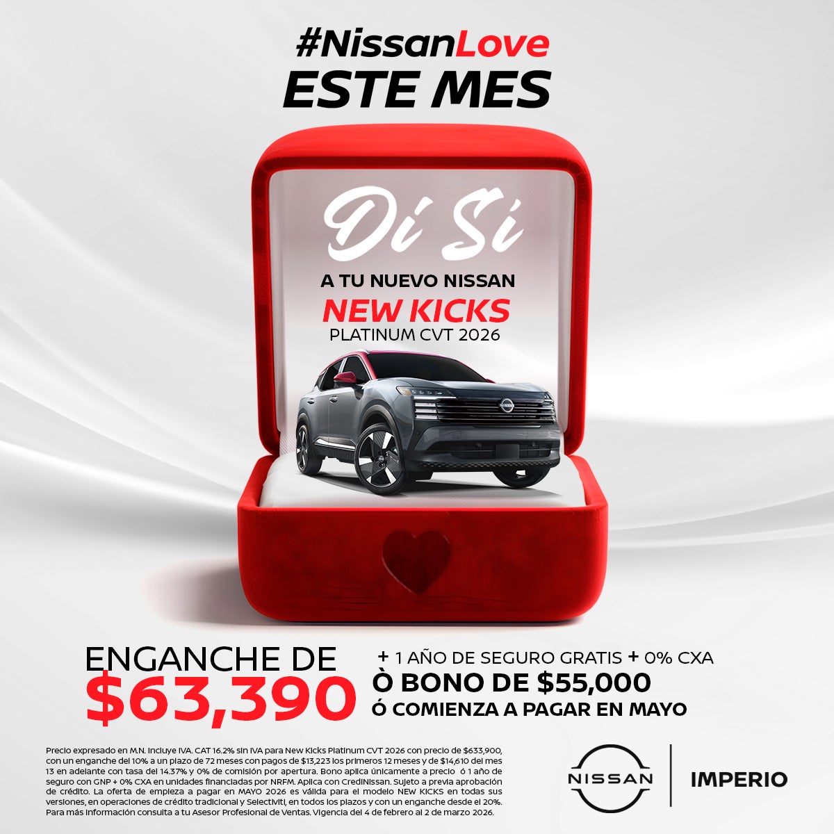 Precio expresado en M.N. Incluye IVA. CAT 16.2% sin IVA para New Kicks Platinum CVT 2026 con precio de $633,900, con un enganche del 10% a un plazo de 72 meses con pagos de $13,223 los primeros 12 meses y de $14,610 del mes 13 en adelante con tasa del 14.37% y 0% de comisión por apertura. Bono aplica únicamente a precio ó 1 año de seguro con GNP + 0% CXA en unidades financiadas por NRFM. Aplica con CrediNissan. Sujeto a previa aprobación de crédito. La oferta de empieza a pagar en MAYO 2026 es válida para el modelo NEW KICKS en todas sus versiones, en operaciones de crédito tradicional y Selectiviti, en todos los plazos y con un enganche desde el 20%. Para más información consulta a tu Asesor Profesional de Ventas. Vigencia del 4 de febrero al 2 de marzo 2026.