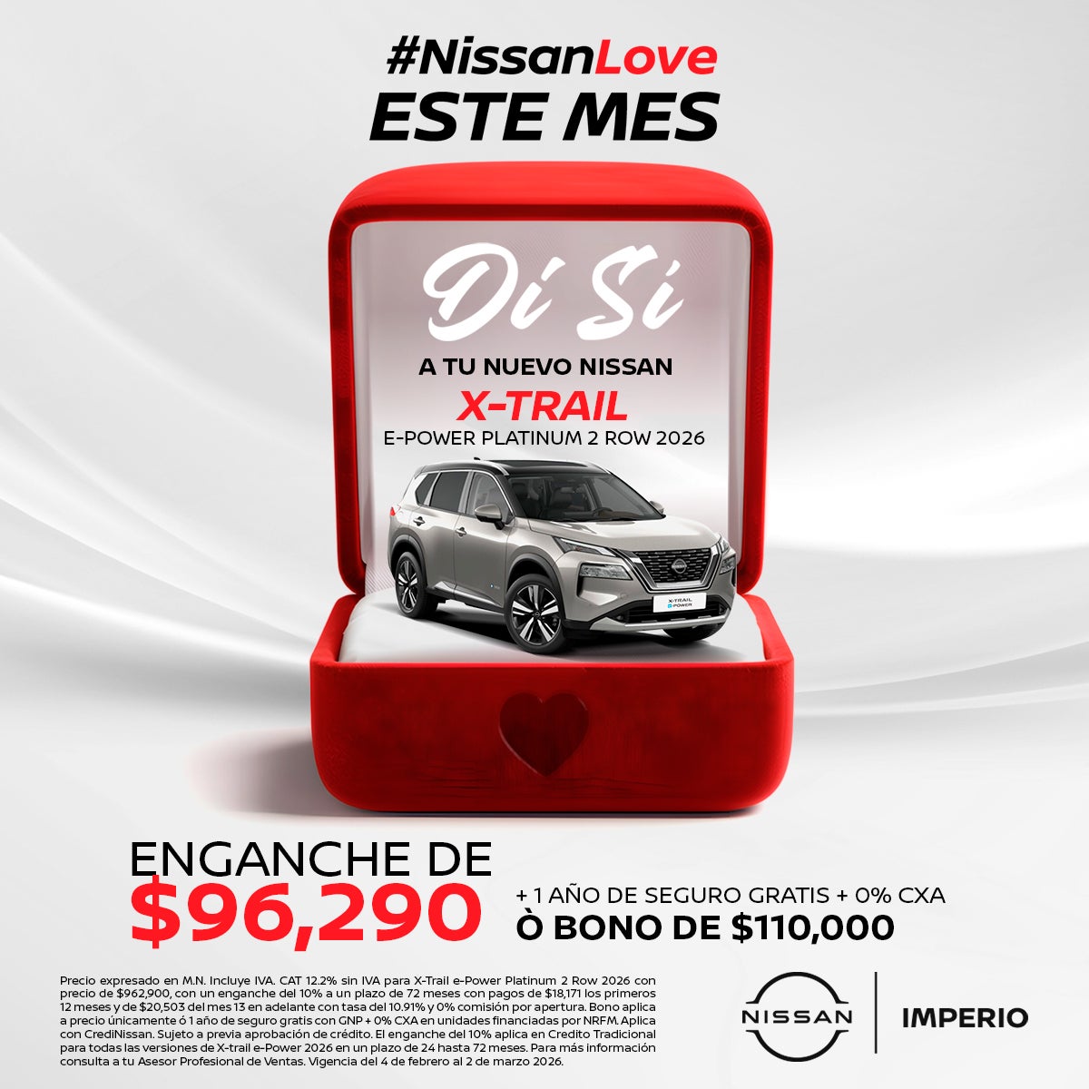 Precio expresado en M.N. Incluye IVA. CAT 12.2% sin IVA para X-Trail e-Power Platinum 2 Row 2026 con precio de $962,900, con un enganche del 10% a un plazo de 72 meses con pagos de $18,171 los primeros 12 meses y de $20,503 del mes 13 en adelante con tasa del 10.91% y 0% comisión por apertura. Bono aplica a precio únicamente ó 1 año de seguro gratis con GNP + 0% CXA en unidades financiadas por NRFM. Aplica con CrediNissan. Sujeto a previa aprobación de crédito. El enganche del 10% aplica en Credito Tradicional para todas las versiones de X-trail e-Power 2026 en un plazo de 24 hasta 72 meses. Para más información consulta a tu Asesor Profesional de Ventas. Vigencia del 4 de febrero al 2 de marzo 2026.