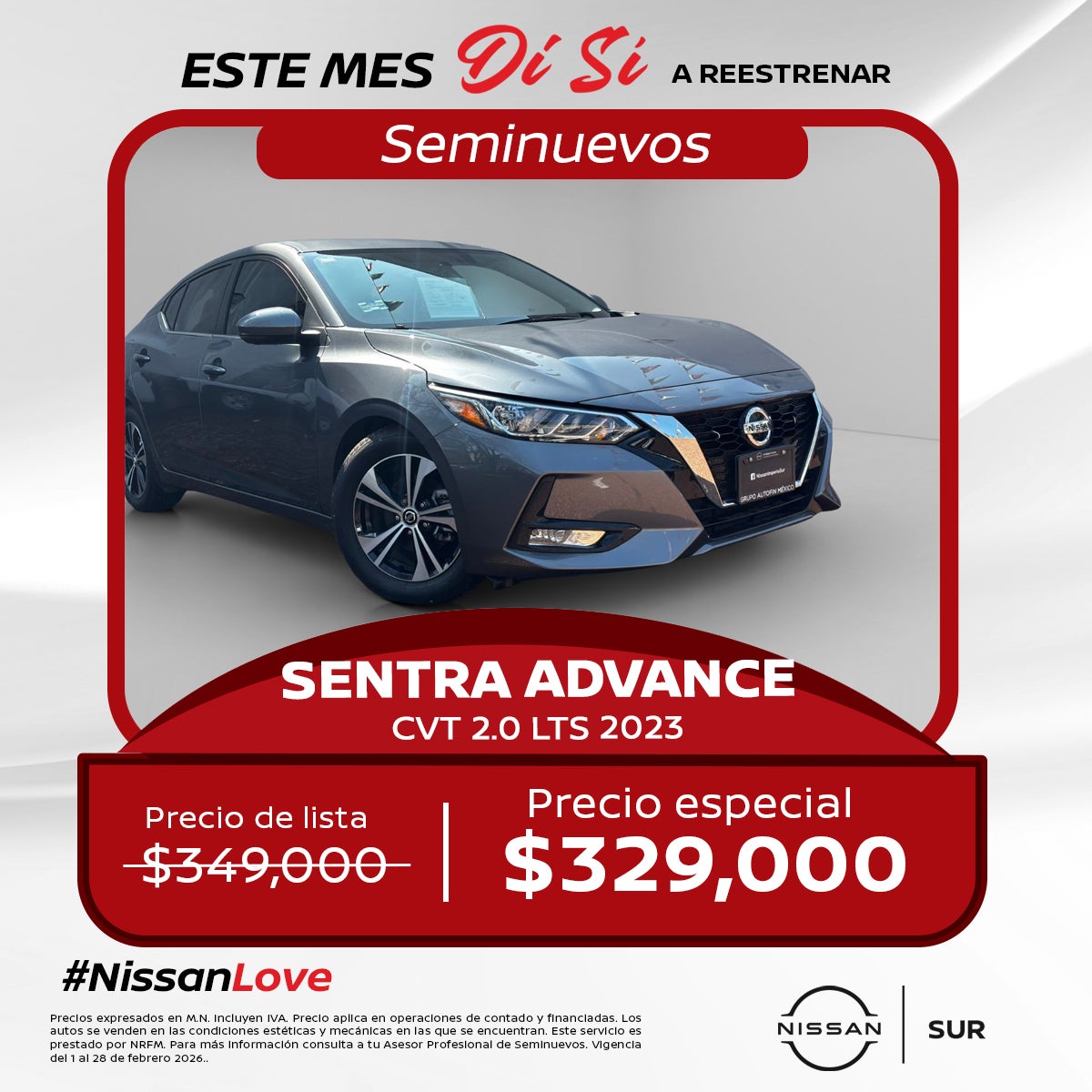 Precios expresados en M.N. Incluyen IVA. Precio aplica en operaciones de contado y financiadas. Los autos se venden en las condiciones estéticas y mecánicas en las que se encuentran. Este servicio es prestado por NRFM. Para más información consulta a tu Asesor Profesional de Seminuevos. Vigencia del 1 al 28 de febrero 2026..
