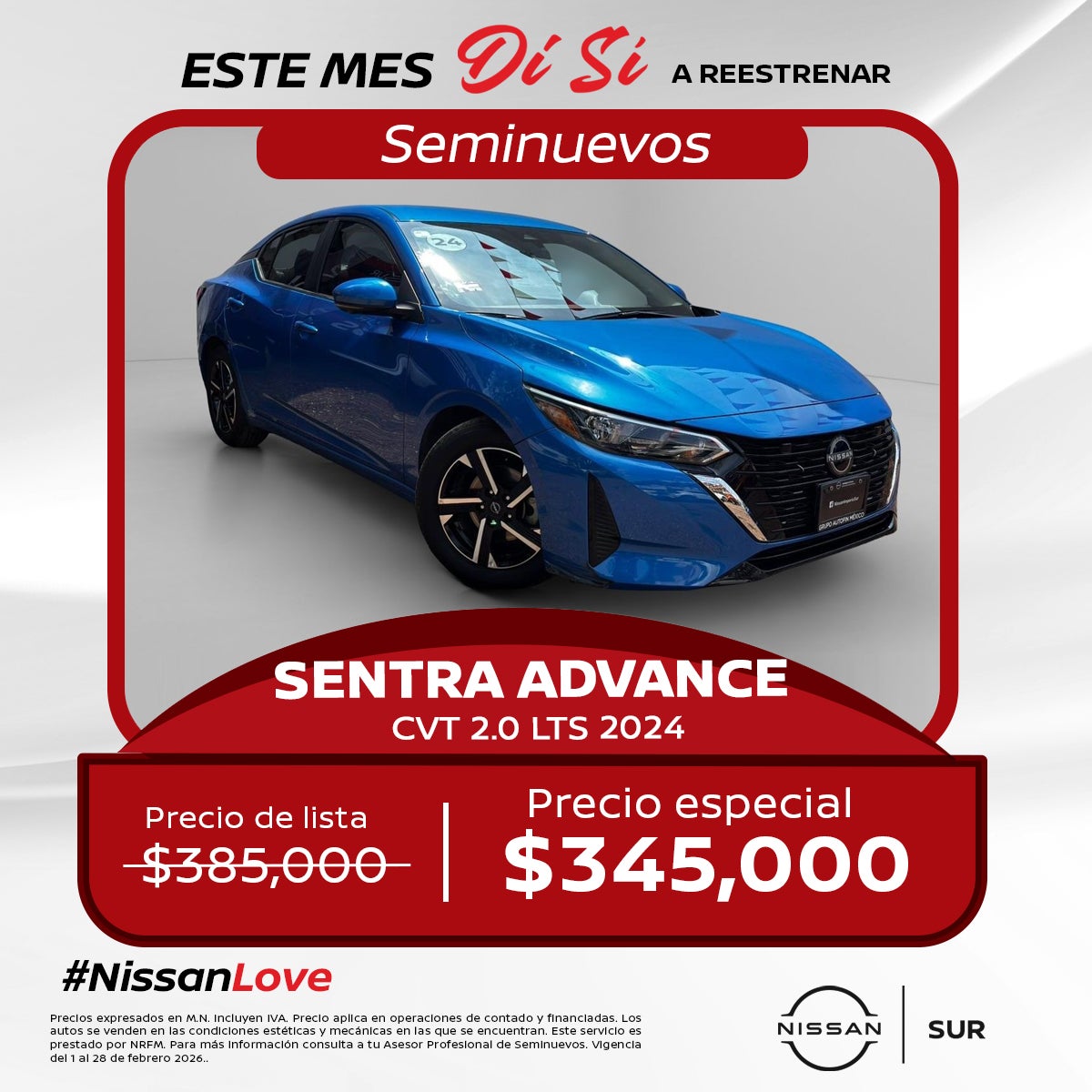 Precios expresados en M.N. Incluyen IVA. Precio aplica en operaciones de contado y financiadas. Los autos se venden en las condiciones estéticas y mecánicas en las que se encuentran. Este servicio es prestado por NRFM. Para más información consulta a tu Asesor Profesional de Seminuevos. Vigencia del 1 al 28 de febrero 2026..